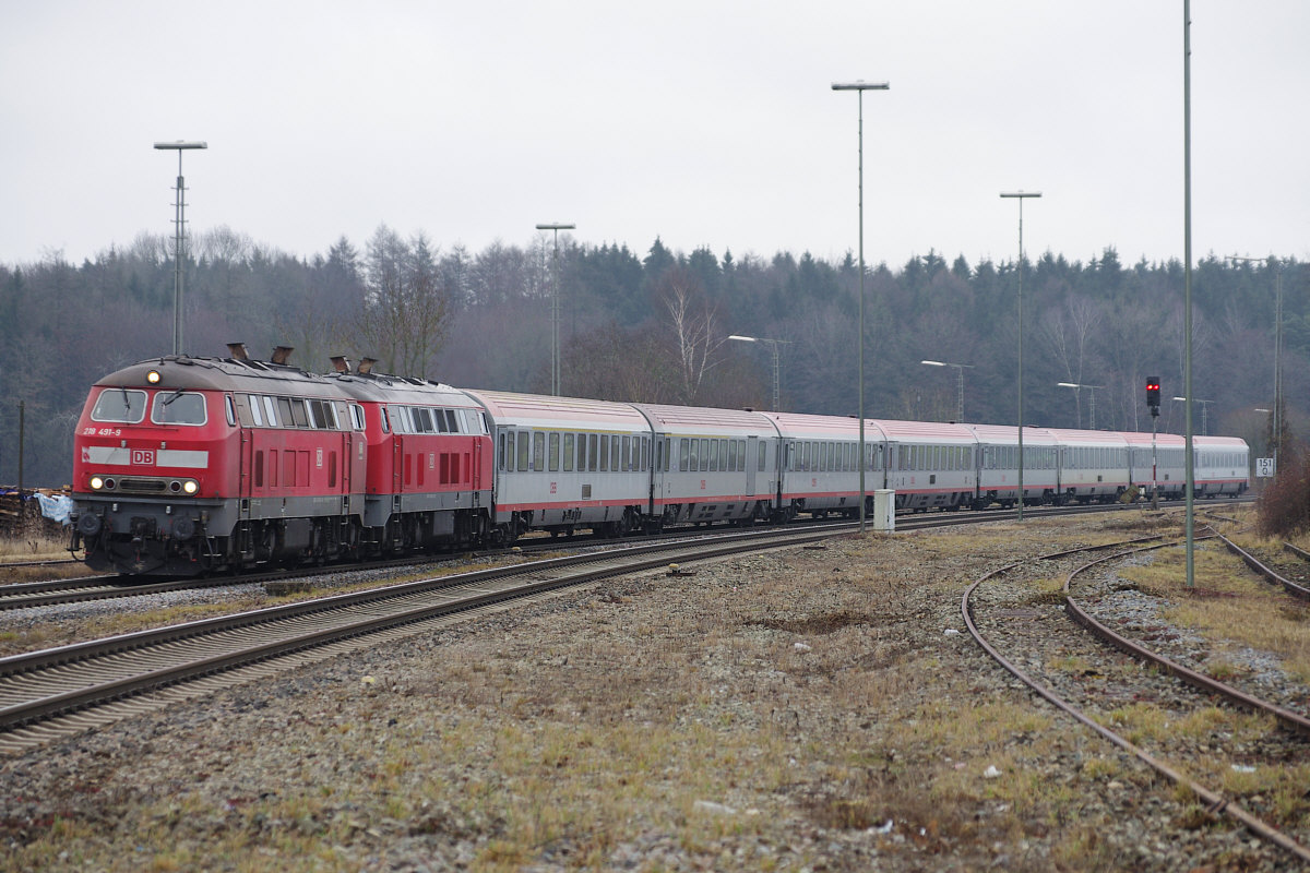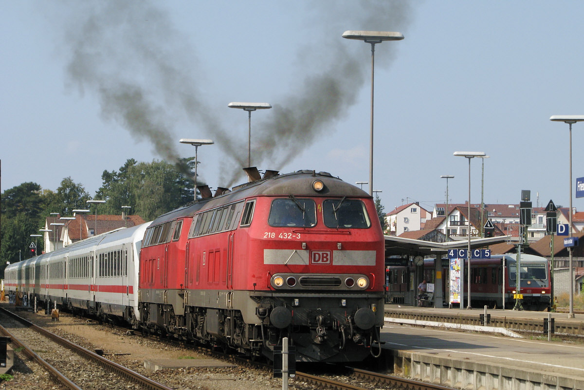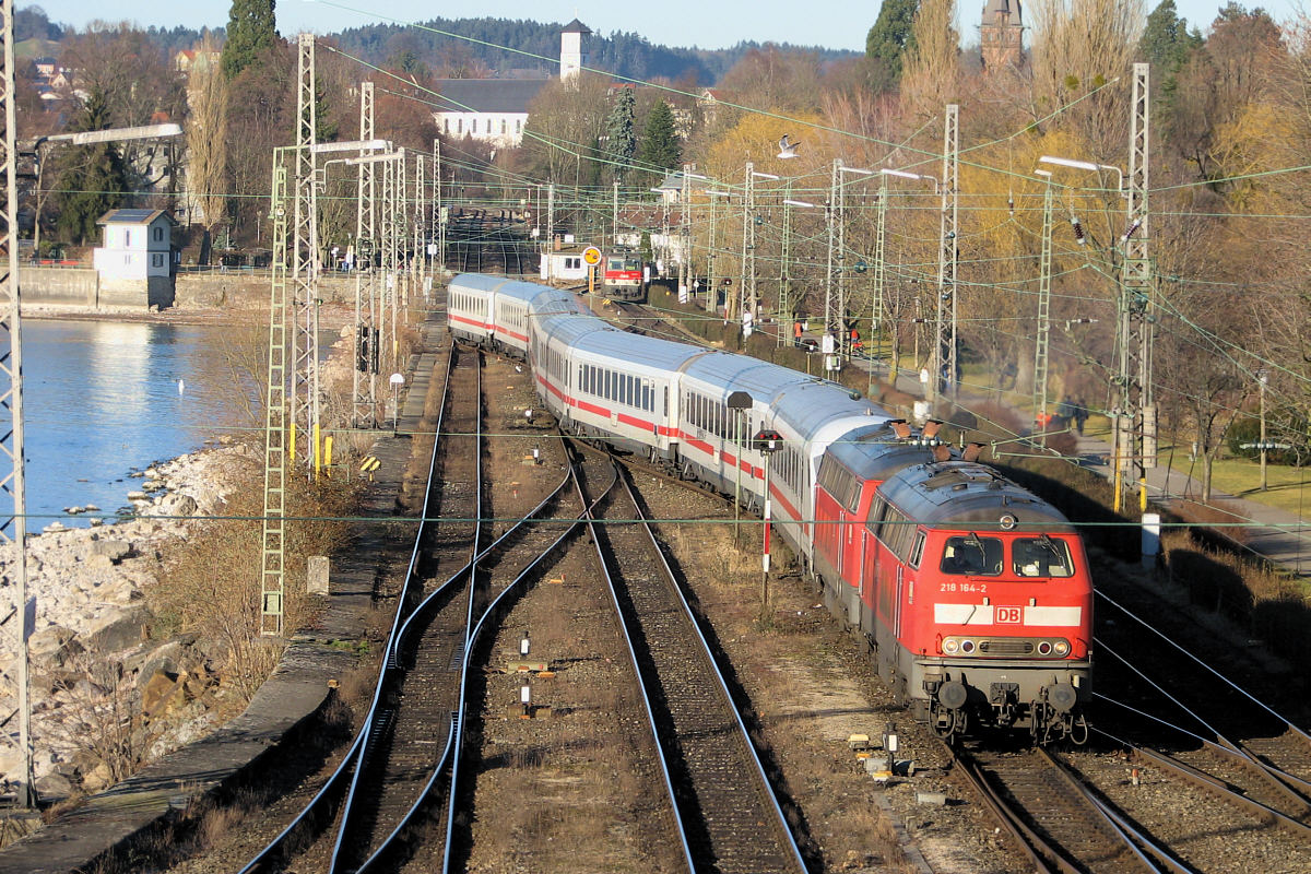 Tags drauf die erste Bespannung (IC118) mit Doppel-218. Auch ein Rangierer ist an Bord, den künftig müssen die Loks in Friedrichshafen den Zug umfahren. Einfahrt Friedrichshafen von Lindau kommend.