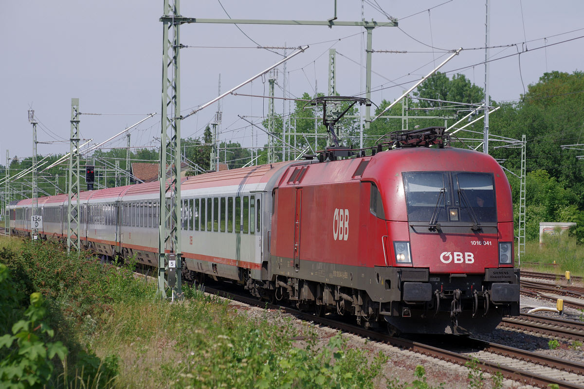 Wer genau schaut sieht am Zugschluss den seit einigen Wochen eingesetzten 1.Klasse Wagen der SBB. Auch night-Jet Wagen der ÖBB waren öfters zu sehen, offenbar war zuletzt das Wagenmaterial knapp.