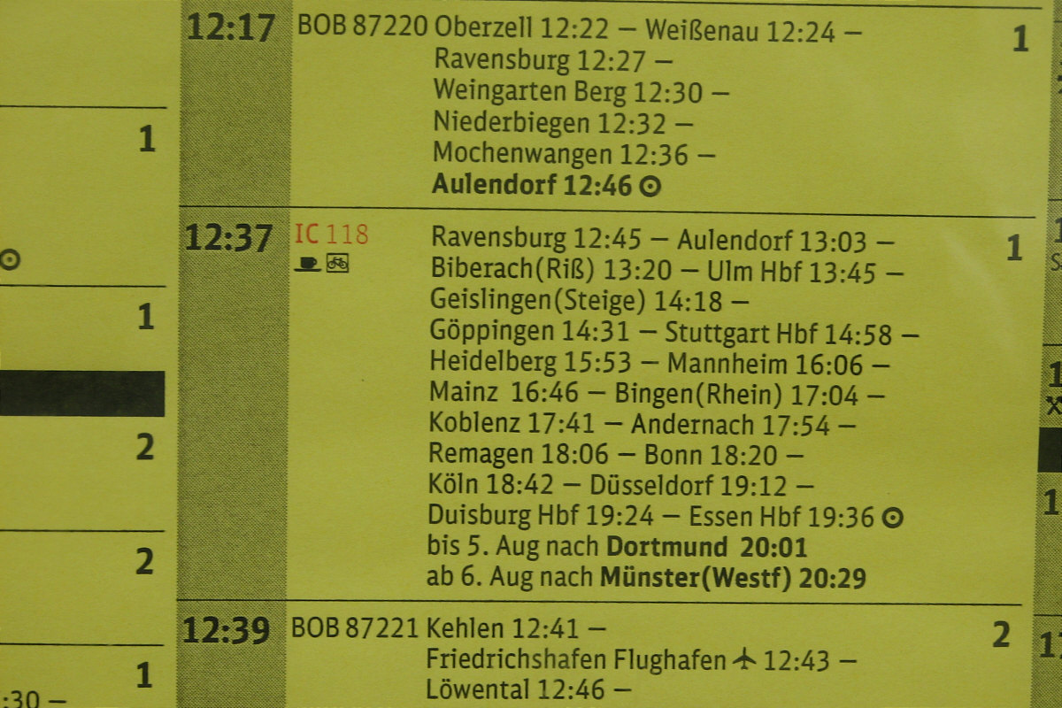 Aushangfahrplan aus Meckenbeuren im Jahr 2007, da hielt der IC noch hier.