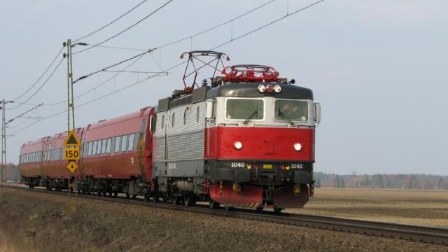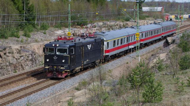 Die Rc3 ist als Schnellzuglok mit 160 km/h ausgelegt. Alles eine Frage des Getriebes. Hier vor einem Personenzug Karlstad - Göteborg bei Brålanda im Jahr 2007