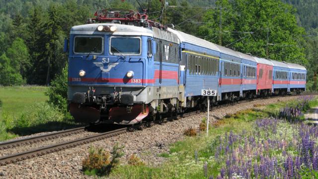 Rc6 1383 mit IC 625 Stockholm - Oslo bei Edane (in der Nähe von Arvika). 2008 sind die Farben noch stimmig. Lupinen im Vordergrund