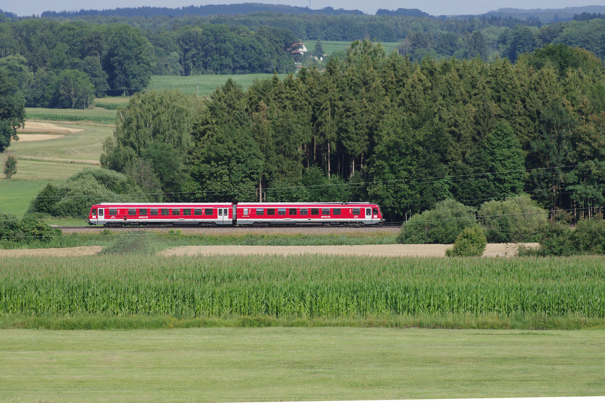 Sonntags wurden für die Ausflugsfahrten auf den Strecken Aulendorf-Pfullendorf und Aulendorf-Bad Wurzach je ein 628 benötigt. Diese kamen morgens als IRE Ulm-Aulendorf und wurden zur Weiterfahrt getrennt. Der IRE 22527 fuhr dann als RB 22680 weiter nach Pfullendorf ( und war sogar als durchgehende Fahrt Ulm-Pfullendorf im Fahrplan). Hier 628-904 als IRE 22527 bei Biberach. Sommer 2020