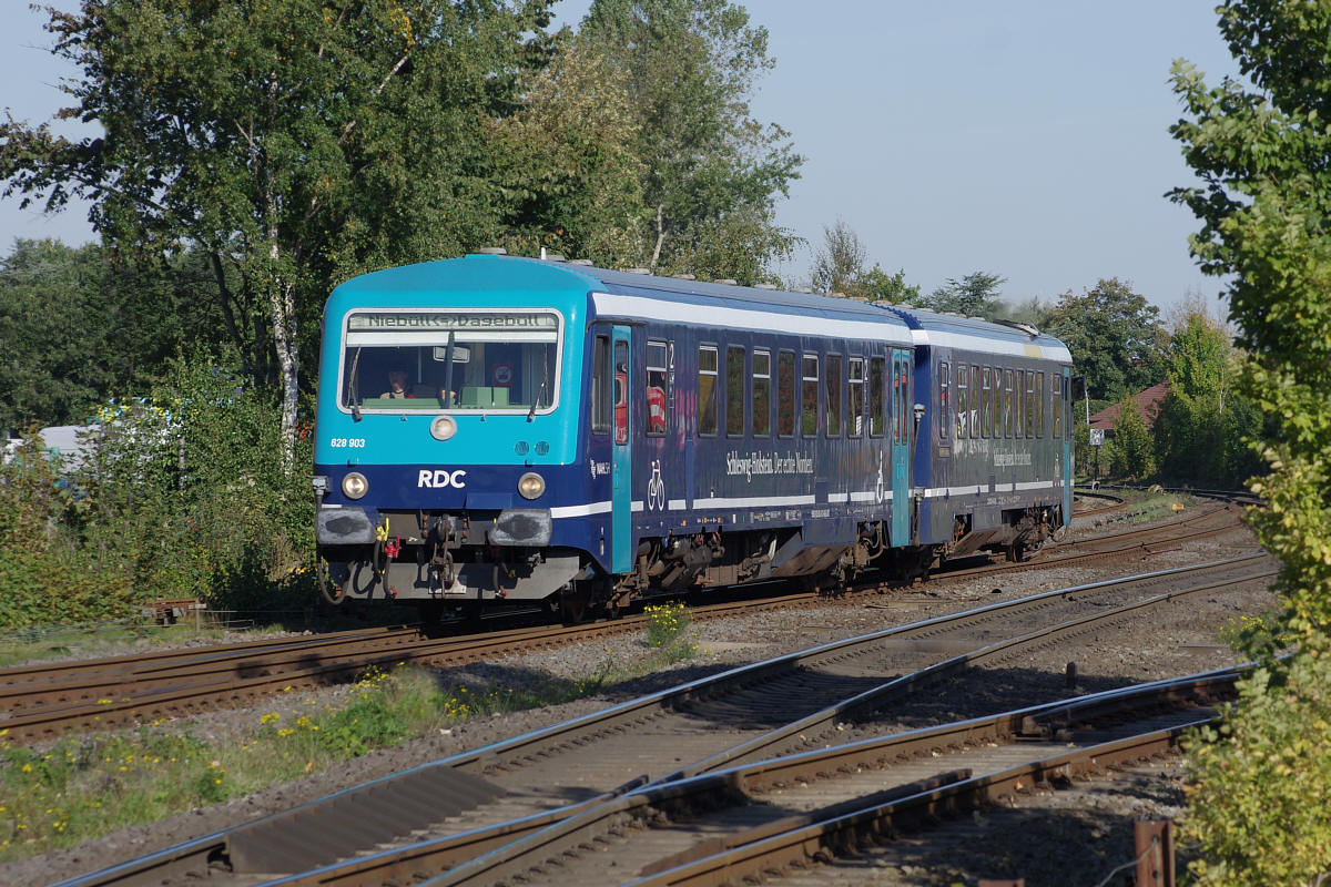 628-903 der NEG bzw RDC im aktuellen Schleswig-Holstein-Design pendelt zwischen Niebüll und Dagebüll, Herbst 2025
