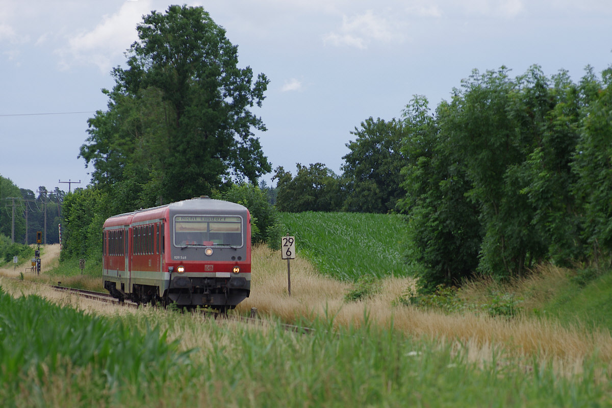 928-548 als RB Lindau-Aulendorf (via Kißlegg) kurz vor Aulendorf. Das Fahrziel "Nicht Eindorf" war ein Zufallstreffer: Die Anzeige wechselte gerade von "Aulendorf" zu "Nicht Einsteigen". Sommer 2020