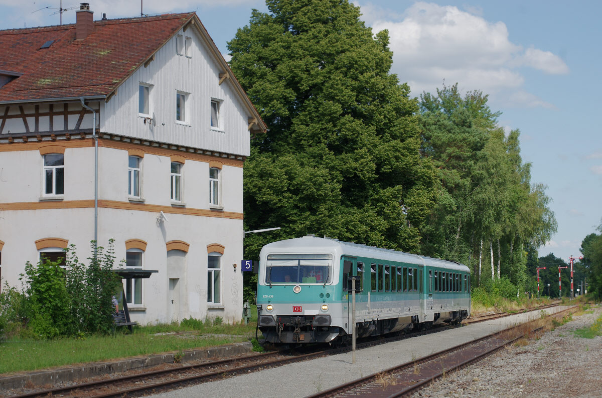 In Roßberg zweigt die Strecke nach Bad Wurzach ab. Hier war an einem Sonntag im Sommer 2012 628-543 als "Radexpress" im Ausflugsverkehr unterwegs.