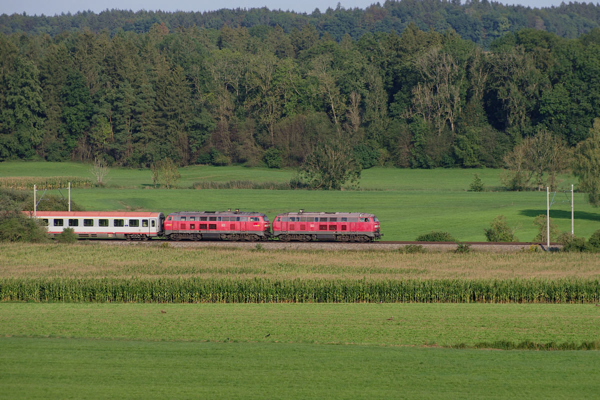 Hier sind 218-448 und 218-462 der Press am IC119 bei Gensenweiler (zwischen Biberach und Aulendorf).