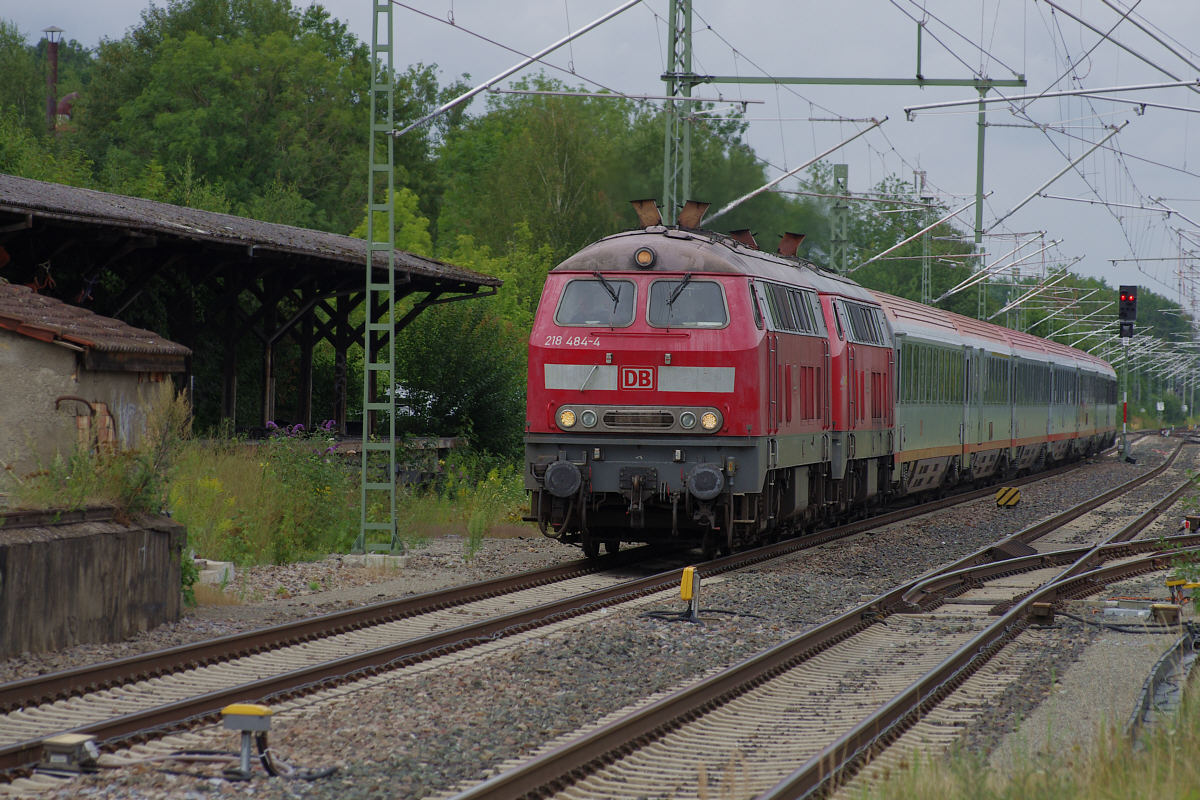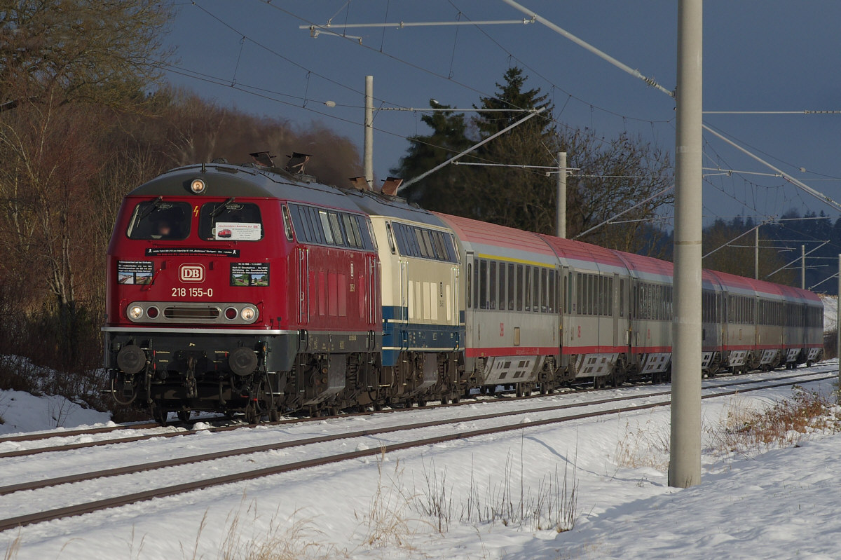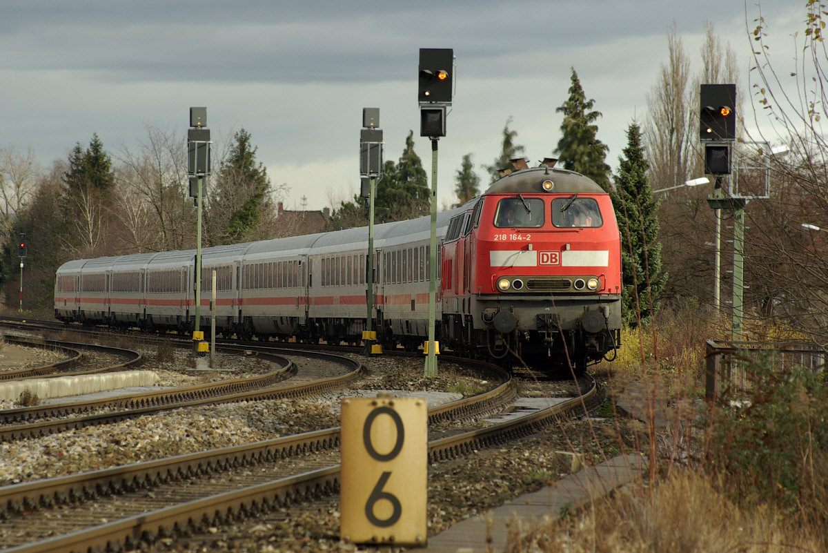 Tags drauf die erste Bespannung (IC118) mit Doppel-218. Auch ein Rangierer ist an Bord, den künftig müssen die Loks in Friedrichshafen den Zug umfahren. Einfahrt Friedrichshafen von Lindau kommend.